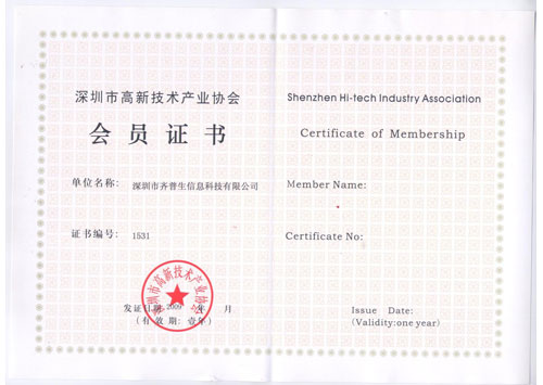 深圳市高新技術(shù)產(chǎn)業(yè)協(xié)會會員證書