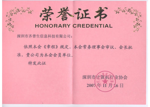 計算機(jī)行業(yè)協(xié)會會員榮譽(yù)(證書)