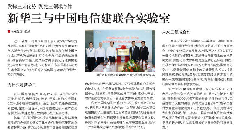 發(fā)揮三大優(yōu)勢(shì) 聚焦三領(lǐng)域合作 新華三與中國(guó)電信建聯(lián)合實(shí)驗(yàn)室(《通信產(chǎn)業(yè)報(bào)》)
