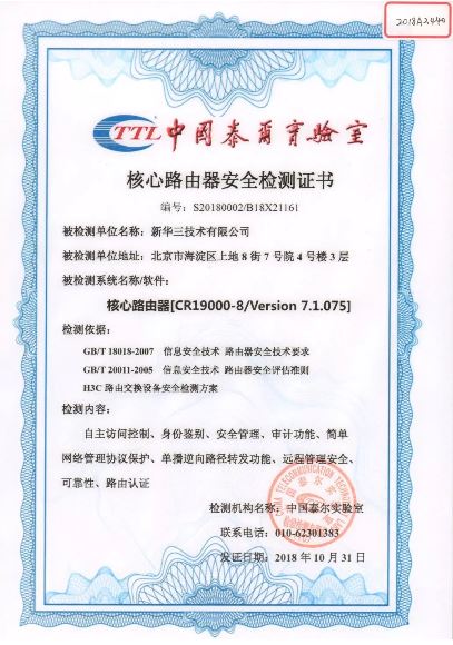 新華三CR19000-8核心路由器獲得泰爾系統(tǒng)實驗室首張網(wǎng)絡設備安全檢測證書